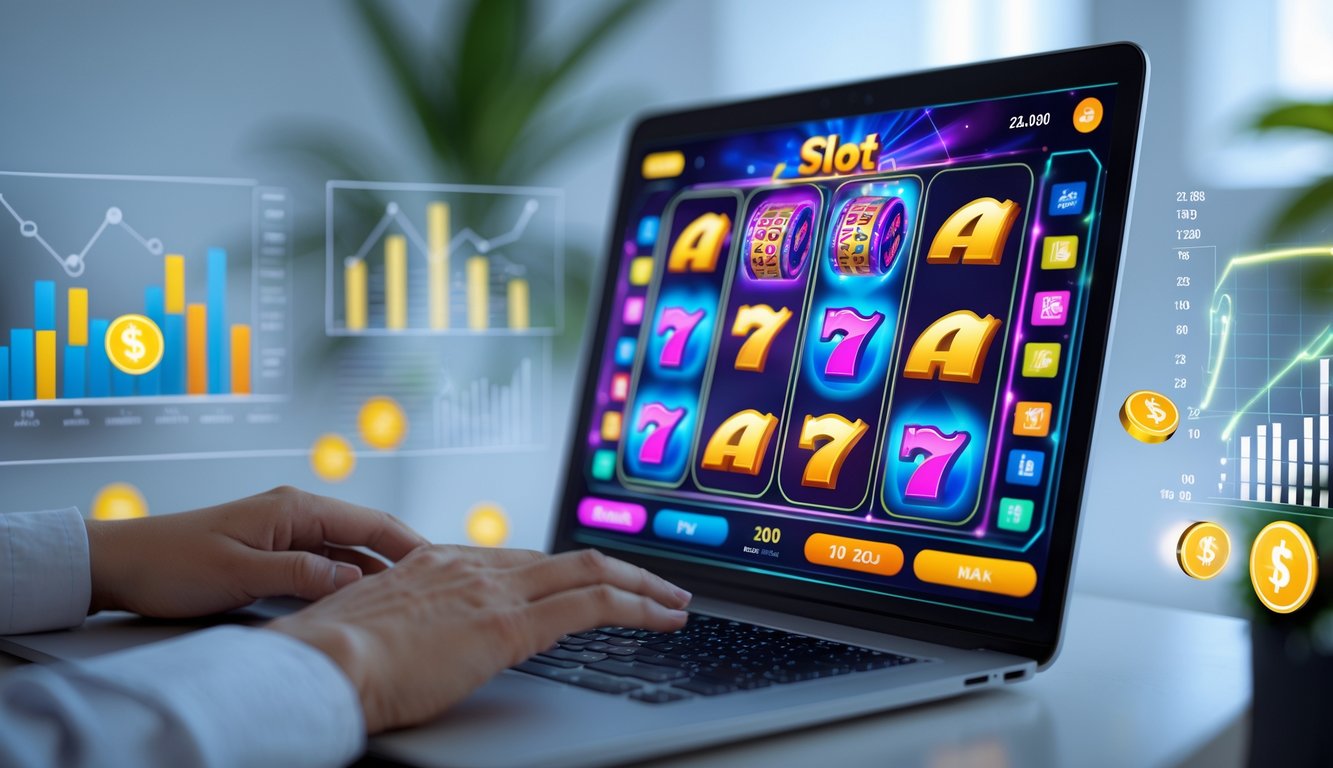 Layar komputer menampilkan grafik mesin slot berwarna cerah dengan latar belakang ruangan kantor modern yang rapi.